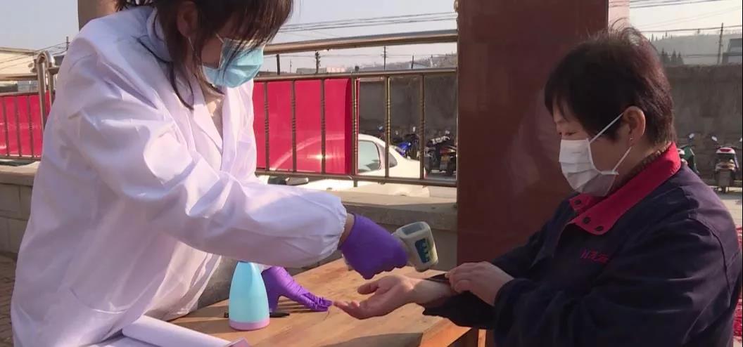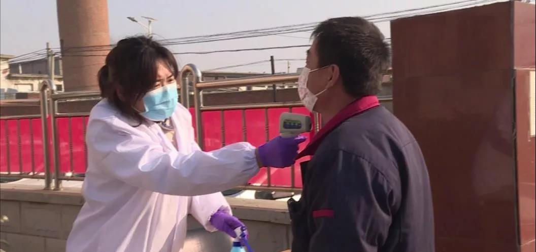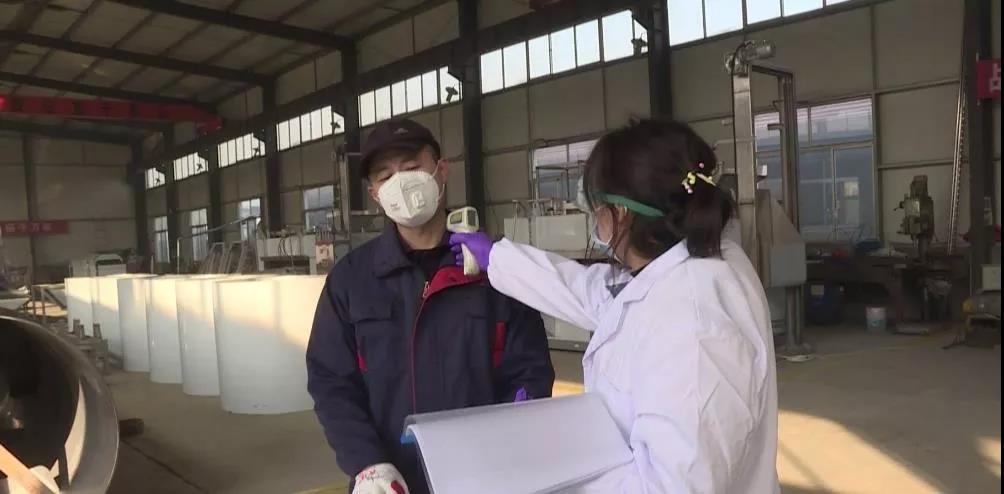 在烟台茂源食品机械有限公司的大门口,公司安排了专门人员为进入厂区的工人进行体温检测,这是企业为切实防止人员流动和集聚带来的交叉感染,有序做好企业复工后疫情防控工作的一项具体举措。