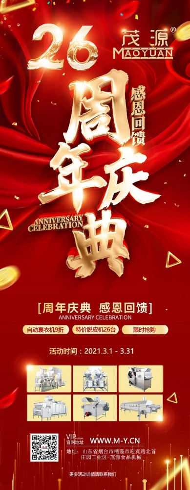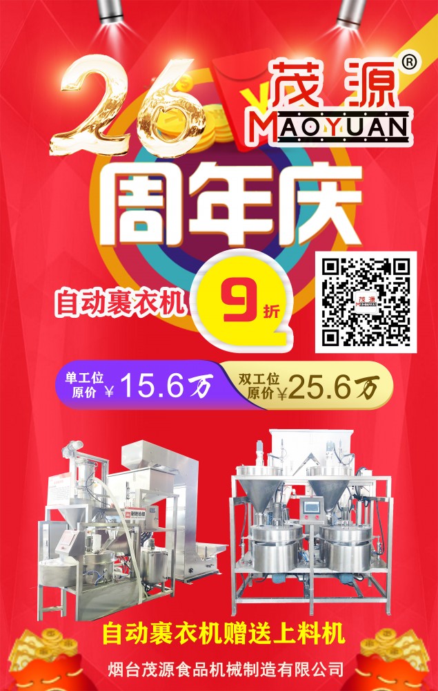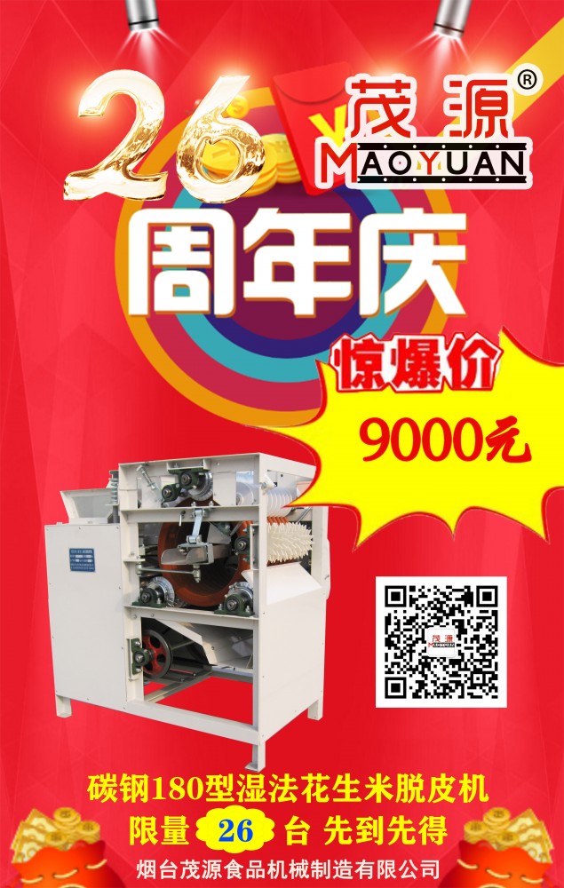 烟台茂源食品机械即将迎来26周年庆,为感谢新老客户长期以来的支持与信任,现特推出以下感恩回馈活动:单工位、双工位自动裹衣机原价15.6万元、25.6万元基础上降价10%,并随机赠上料机;碳钢180型湿法花生米脱皮机特价9000元,限量26台,先到先得!